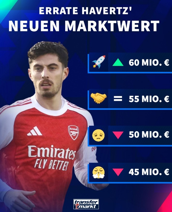 哈弗茨本賽季飽受傷病困擾,在英超只有5次出場,送出1次助攻。目前哈弗茨德轉身價5500萬歐,德轉給出其更新后最高身價可能升至6000萬歐,最低則會跌至4500萬歐。