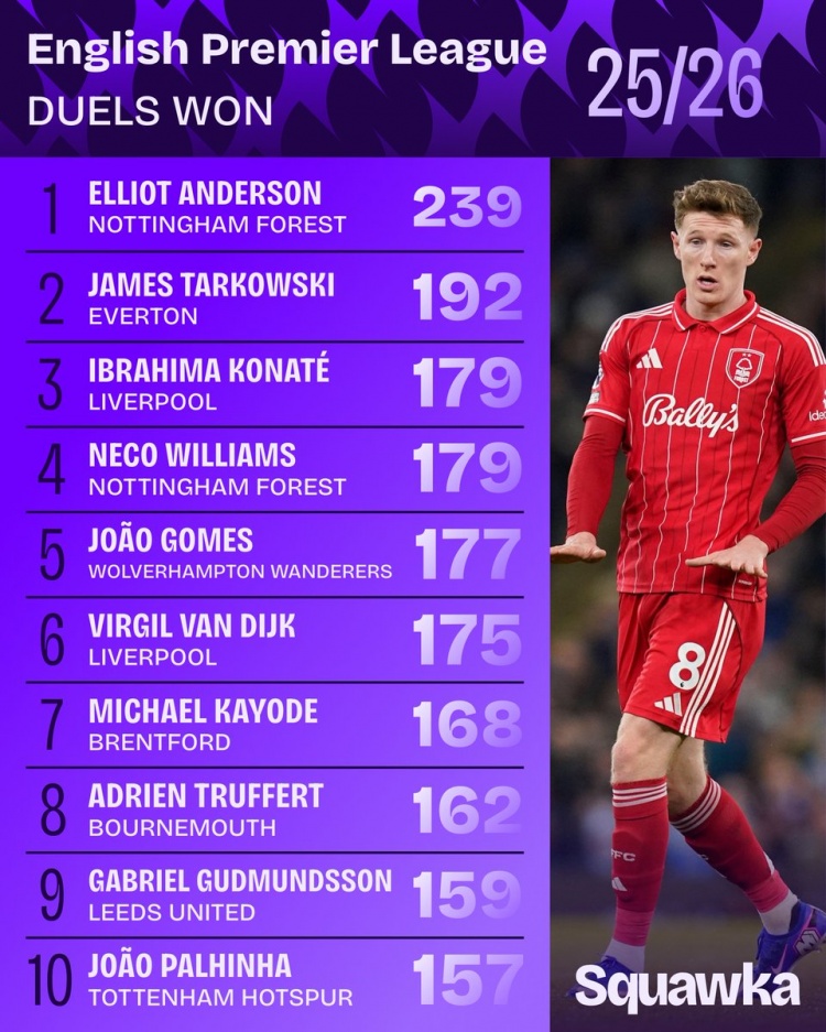 本賽季英超對(duì)抗成功次數(shù)排名: