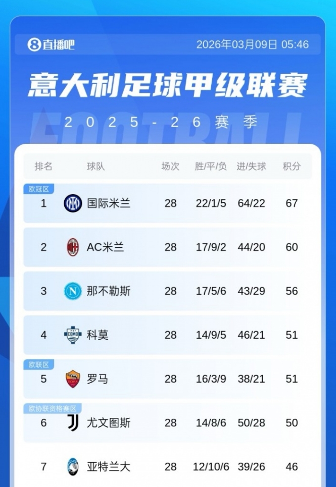 意甲積分榜:米蘭距榜首國米7分,羅馬輸球降第5尤文距前4僅1分