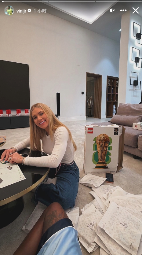直播吧03月01日訊 維尼修斯在個人社媒曬照,畫面中,他與女友圍坐在客廳,一起組裝樂高版大力神杯,地上散落著樂高零件包。