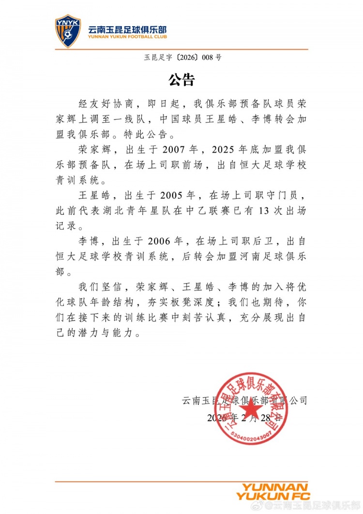 經(jīng)友好協(xié)商,即日起,我俱樂(lè)部預(yù)備隊(duì)球員榮家輝上調(diào)至一線隊(duì),中國(guó)球員王星皓,李博轉(zhuǎn)會(huì)加盟我俱樂(lè)部。特此公告。