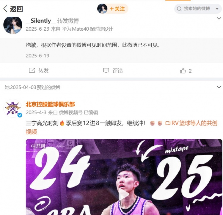 而該位網(wǎng)友的關注列表里面,僅有廖三寧這一名北控男籃球員。而在其關注列表里面,還有一名@_Silently_的與廖三寧相互關注了,而且也多次點贊了廖三寧的相關內容。