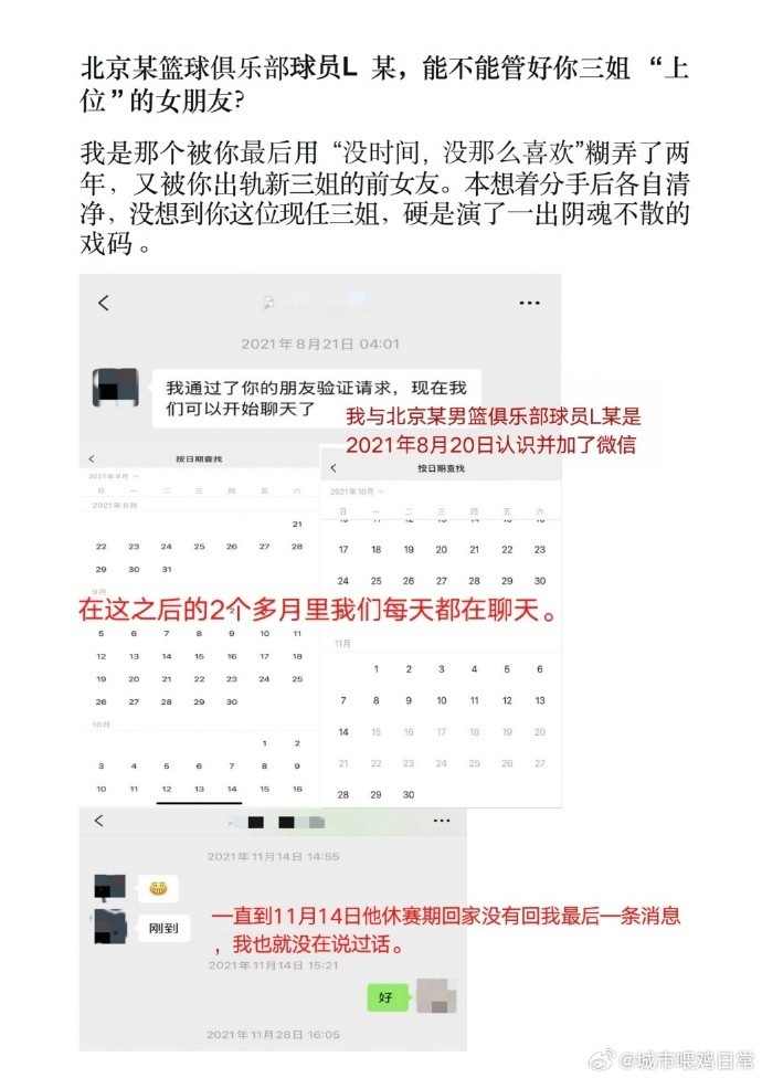 直播吧3月9日訊 網(wǎng)名@城市喂雞日常在今年的2月曬出多張圖片,表示北京某籃球俱樂部的球員L某劈腿,還被這位L某的小三騷擾。
