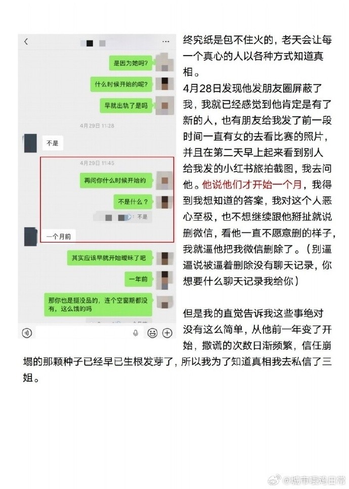 @城市喂雞日常曬出多張與L某小三的聊天紀錄截圖,并寫道:“《臆想癥三姐篇》”,詳見下圖: