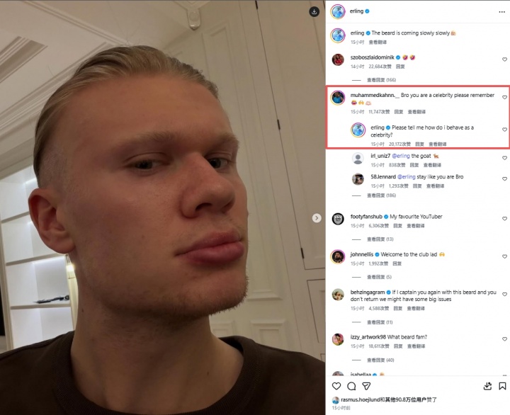 哈蘭德社媒曬出自拍照片,配文:“胡子正在慢慢長出來?!?/p>
