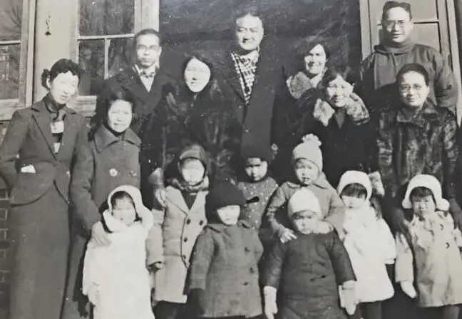 燕京大學(xué)幼兒園部分兒童和家長,攝于1938年。后兩排左起:戴克范、梁思莊(梁啟超之女)、方貺予、倪逢吉(梅貽寶夫人)、周學(xué)章、許淑文(周學(xué)章夫人)、冰心、梅貽寶、吳紹鴻。兒童當(dāng)中,站在周學(xué)章前方的是周懿嫻,前排居中的是周乃揚(yáng)。?
