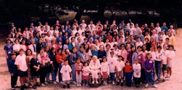 周懿嫻從中國女籃教練崗位退休后赴美定居。1994年,許芹家族后人聚會(huì),100多人相聚在加州蒙特雷,時(shí)年61歲的周懿嫻也在其中(第四排右五穿黃色上衣者)。?