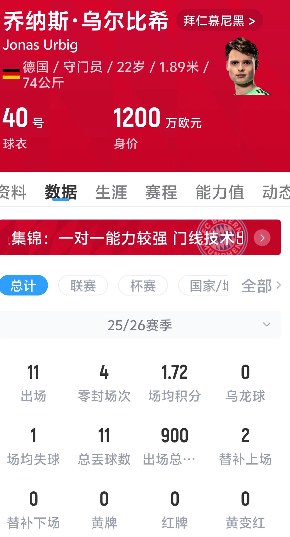 烏爾比希,現(xiàn)年22歲,身價(jià)1200萬(wàn)歐,為拜仁慕尼黑出場(chǎng)11次,零封4次,場(chǎng)均失球1粒,總丟球11粒。