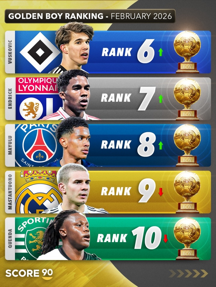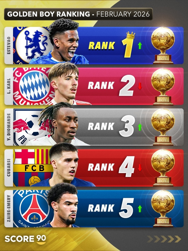 直播吧02月28日訊 Score90給出了2026年金童獎2月份最新排名預(yù)測,埃斯特旺升至榜首,卡爾第二,迪奧曼德升至第三。