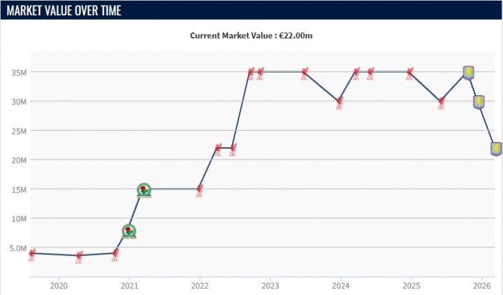 埃利奧特現(xiàn)年22歲,他去年夏天被利物浦租借給維拉,但本賽季至今僅出場(chǎng)7次共270分鐘,貢獻(xiàn)1球。他的身價(jià)連續(xù)兩次下跌,從3500萬(wàn)歐跌剩2200萬(wàn)歐。