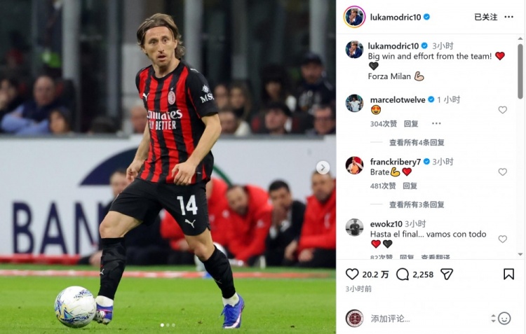 莫德里奇社媒曬出比賽照片,并寫道:“重要的勝利,全隊表現(xiàn)都很出色!加油米蘭!”