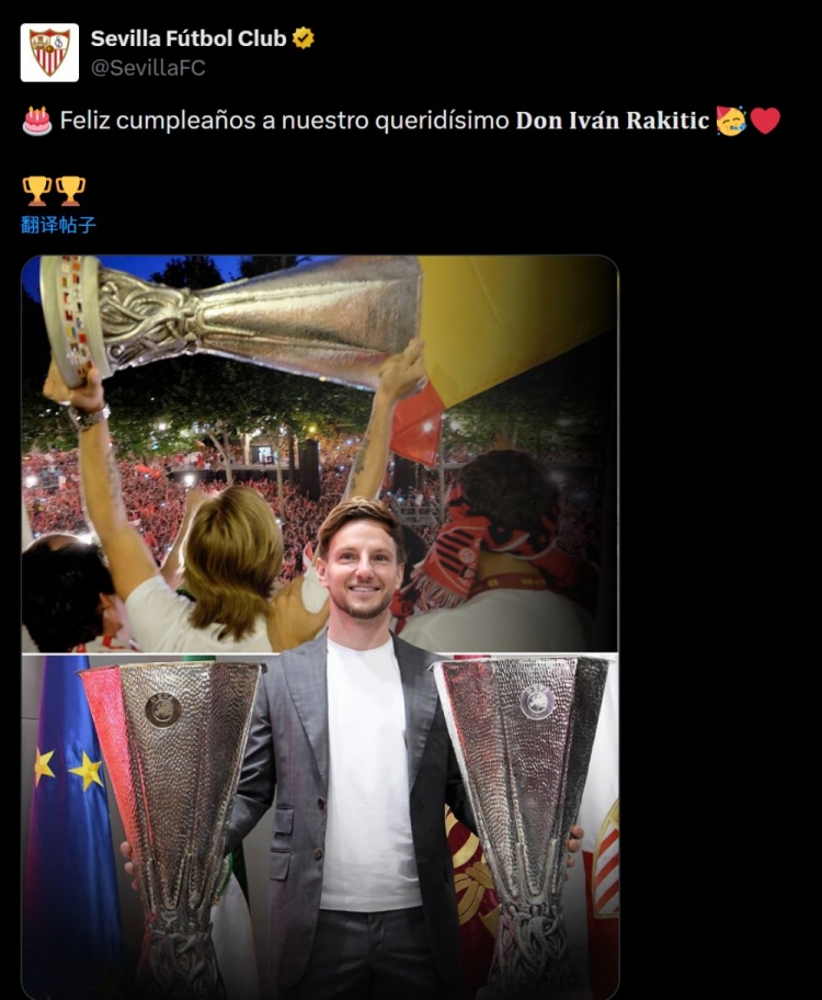 塞維利亞官方社媒曬出拉基蒂奇與獎杯的合照,配文:“祝我們最親愛的拉基蒂奇生日快樂!”