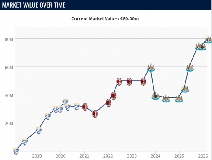 托納利現(xiàn)年25歲,意大利籍中場(chǎng),在2023年以超6000萬(wàn)歐元的轉(zhuǎn)會(huì)費(fèi)從米蘭加盟紐卡。但球員在2023年因賭球被禁賽10個(gè)月,球員身價(jià)也一度跌至3800萬(wàn)歐元。