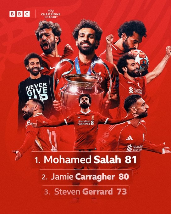 薩拉赫迎來利物浦生涯第81次歐戰(zhàn)出場(chǎng),超越卡拉格成為隊(duì)史歐戰(zhàn)出場(chǎng)最多球員,杰拉德以73場(chǎng)位居第3。
