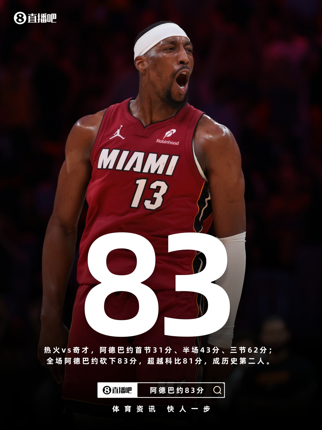 全場比賽,阿德巴約出戰(zhàn)42分鐘,投籃43中20,三分22中7,罰球43中36,砍下83分。僅次于張伯倫的100分。