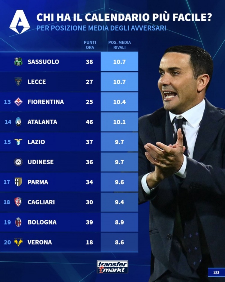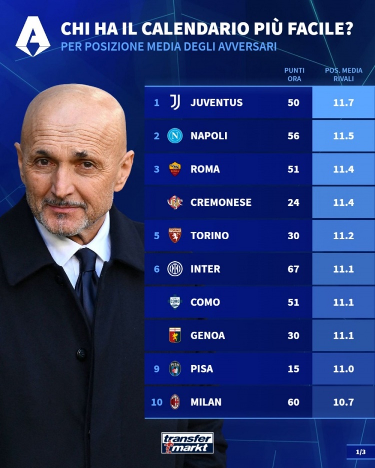 直播吧3月11日訊 德國轉會市場統計了意甲各隊剩余10輪對手的平均排名,并列出榜單,尤文的對手平均排名最低。