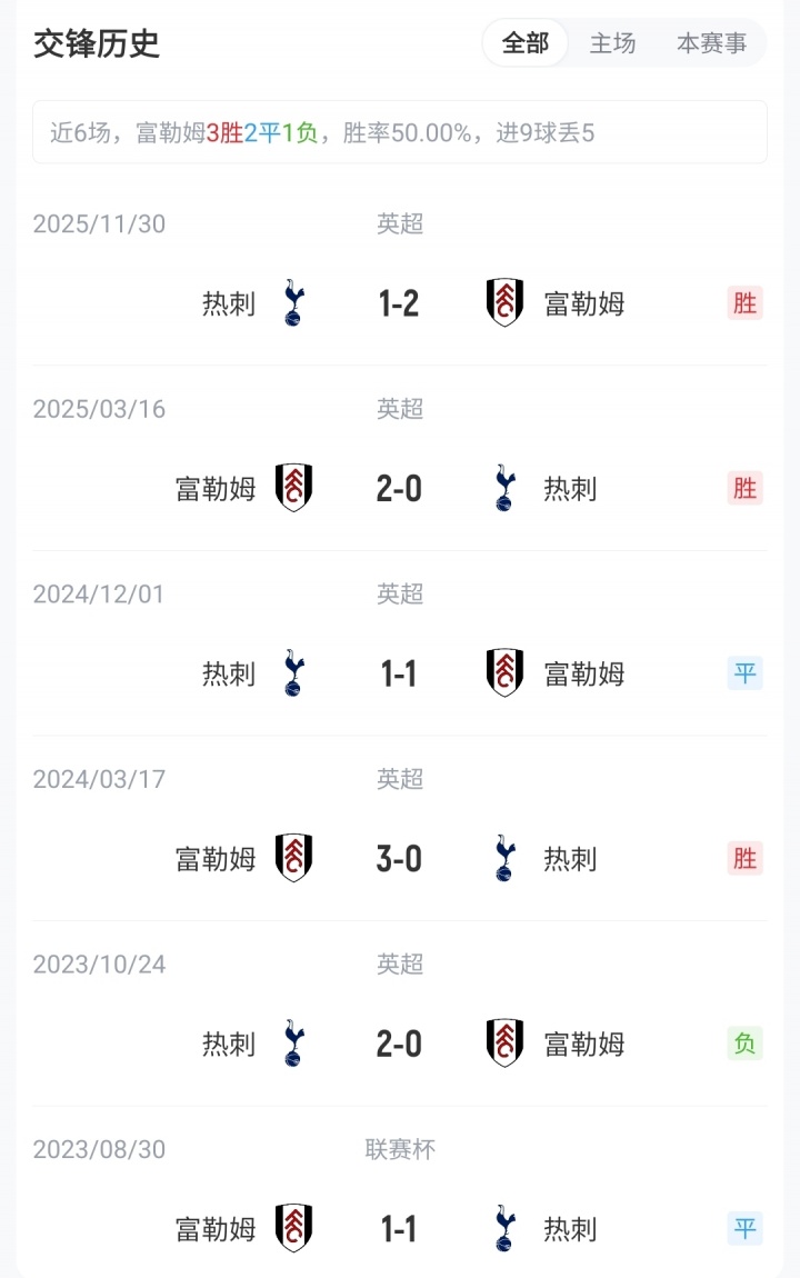 目前英超積分榜上,富勒姆11勝4平12負(fù)積37分,位列第10;熱刺7勝8平12負(fù)積29分,位列第16。雙方賽季首次交鋒中,熱刺主場1-2不敵富勒姆。