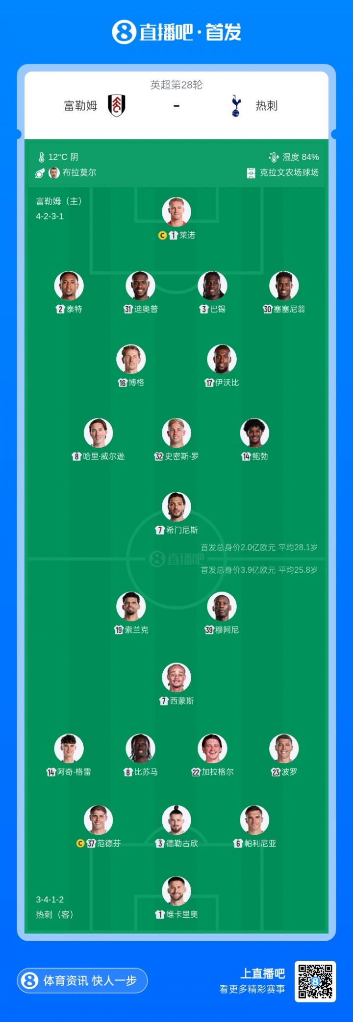 直播吧03月01日訊 北京時(shí)間22點(diǎn),英超第28輪,富勒姆vs熱刺,賽前雙方首發(fā)公布。